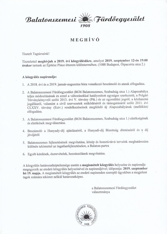 - A Balatonszemesi Fürdőegyesület (8636 Balatonszemes, Szabadság utca 1.) Alapszabálya teljes módosításának és ezzel a változásokkal hatályosított egységes szerkezetű, a Polgári Törvénykönyvről szóló 2013. évi V. törvény (Ptk.) és az egyesülési jogról, a közhasznú jogállásról, valamint a civil szervezetek működéséről és támogatásáról szóló 2011. évi CLXXV. törvény (Ectv.) rendelkezéseinek megfelelő új Alapszabályának (melléklet) elfogadása.